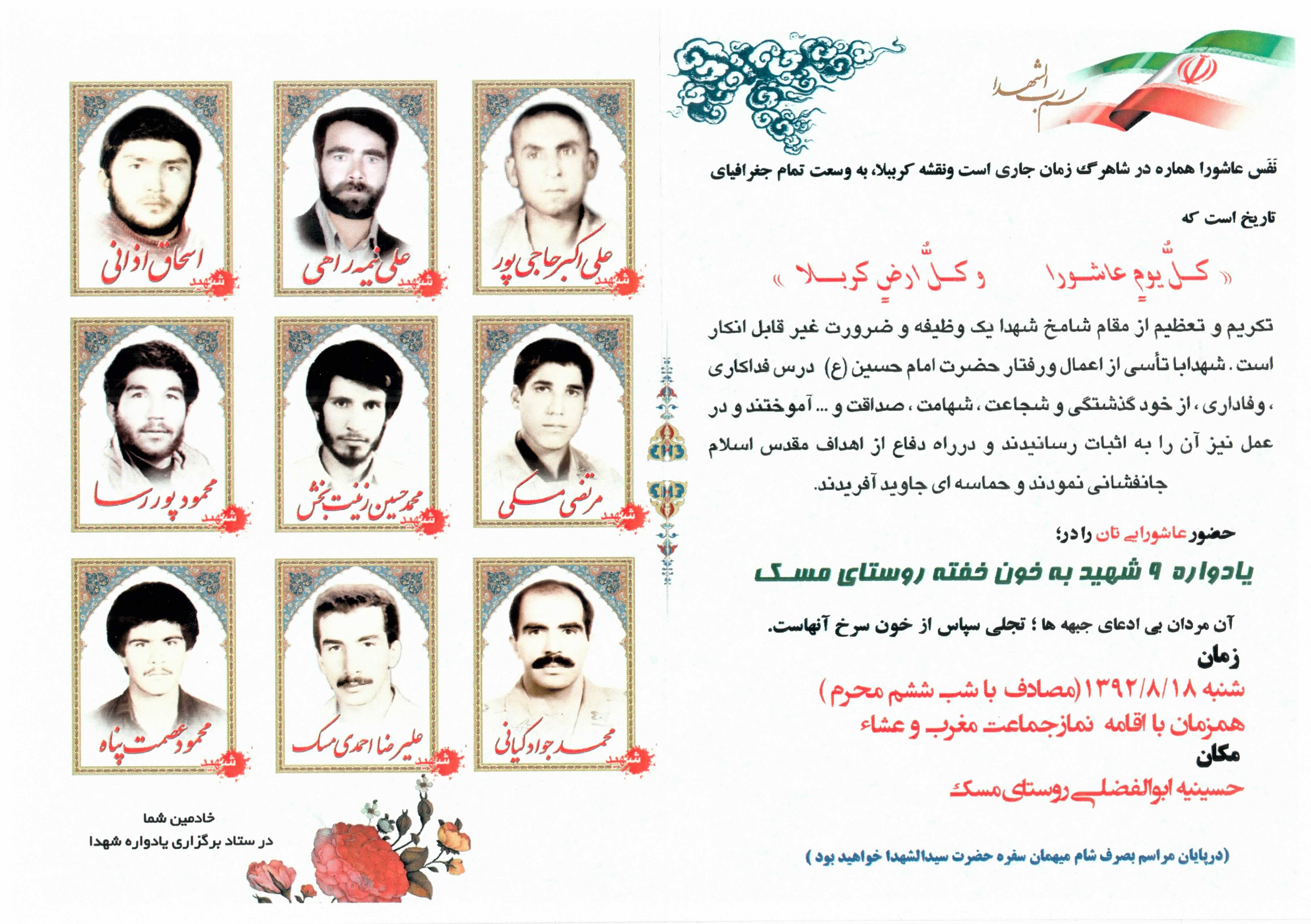 در روستای مسک هر کدام از علم ها به نام یکی از ائمه (ع) برپا می شود. به این ترتیب، دوازده علم به نام دوازده امام و دو علم به نام حضرت فاطمه زهرا (س) و حضرت ابوالفضل (ع) در روستا گردانده می شود.